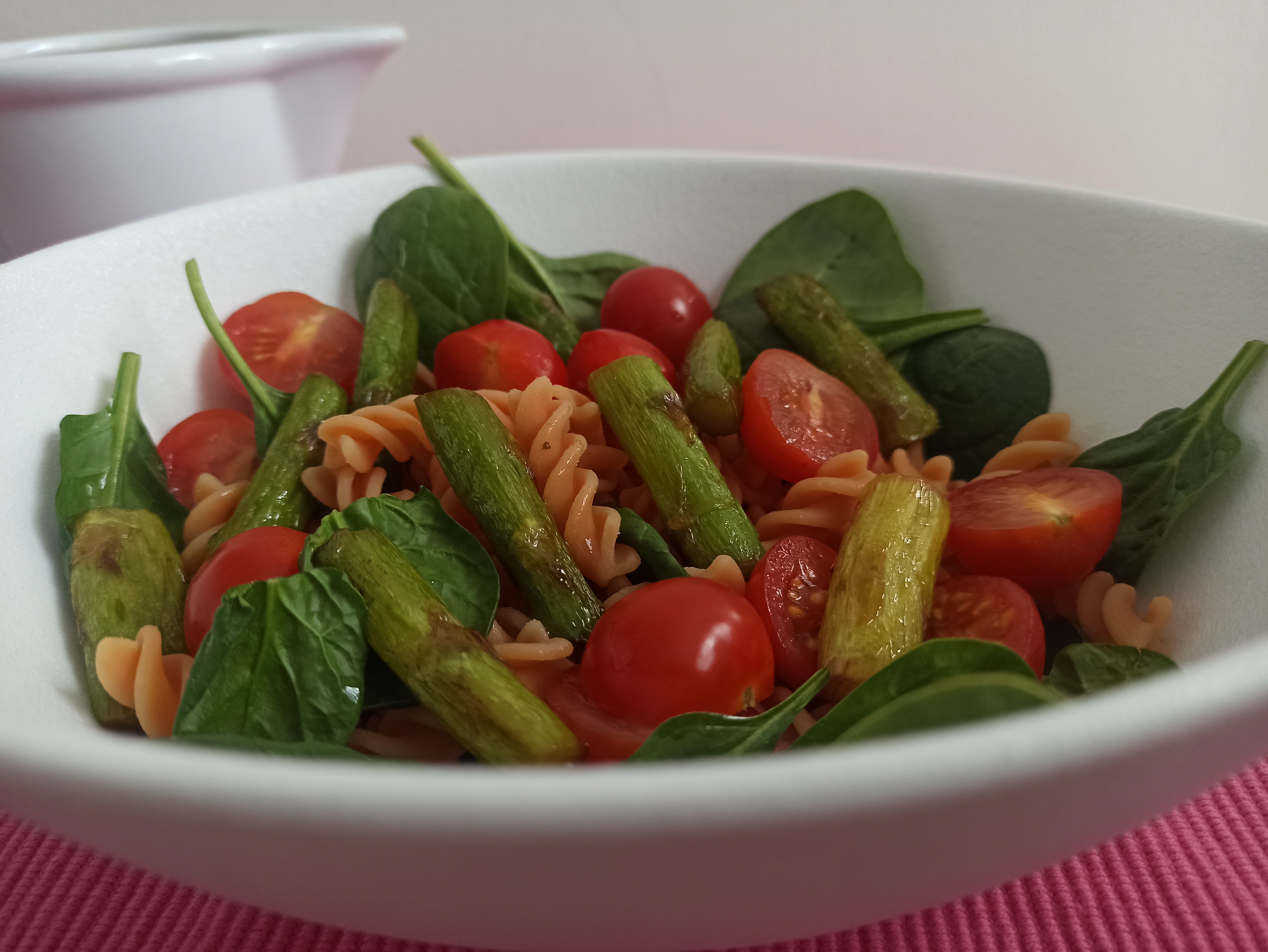 Hoy te propongo una ensalada con ingredientes de temporada esparragos verdes y las fresas. Y usamos como base una pasta, la que más te guste, preferiblemente corta, y la acompañamos de brotes de espinacas y tomates cherry y a disfrutar.