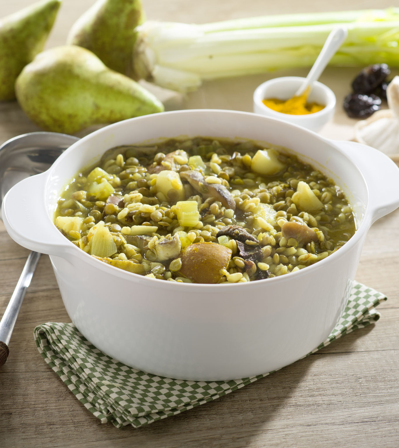 - Ponga en el vaso las lentejas hidratadas bien escurridas, las setas hidratadas bien escurridas, el nabo, el apio, la pera, la cebolla, el aceite, la sal, la cúrcuma, el comino y el agua. Programe 20 min/100°C/Giro a la inversa/vel cuchara.