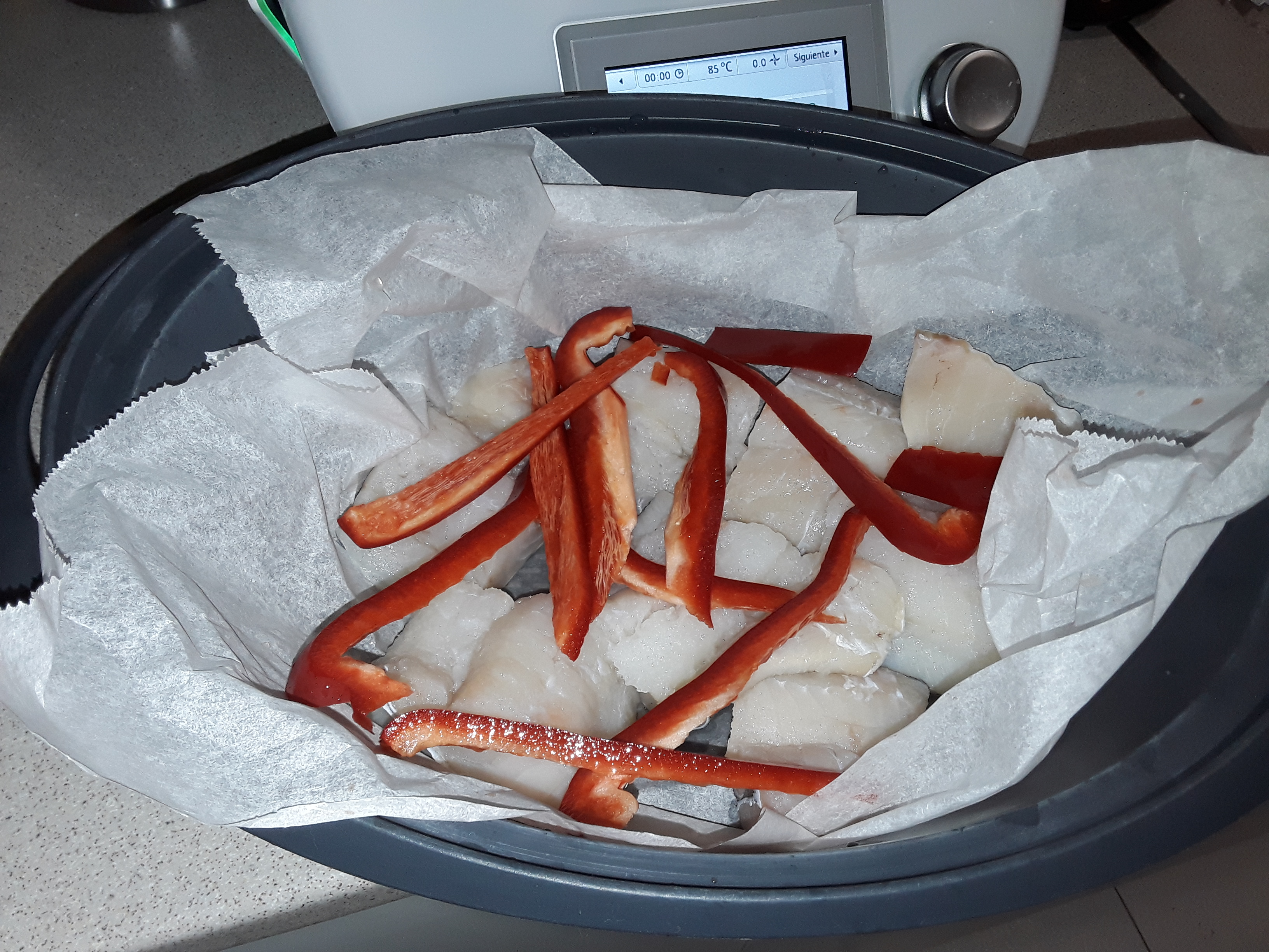☆Mientras se sofríen, forramos la bandeja del recipiente varoma con papel para hornear (papel vegetal). Encima colocamos los lomos de bacalao y el pimiento rojo y vertemos la leche. Tapamos y reservamos.