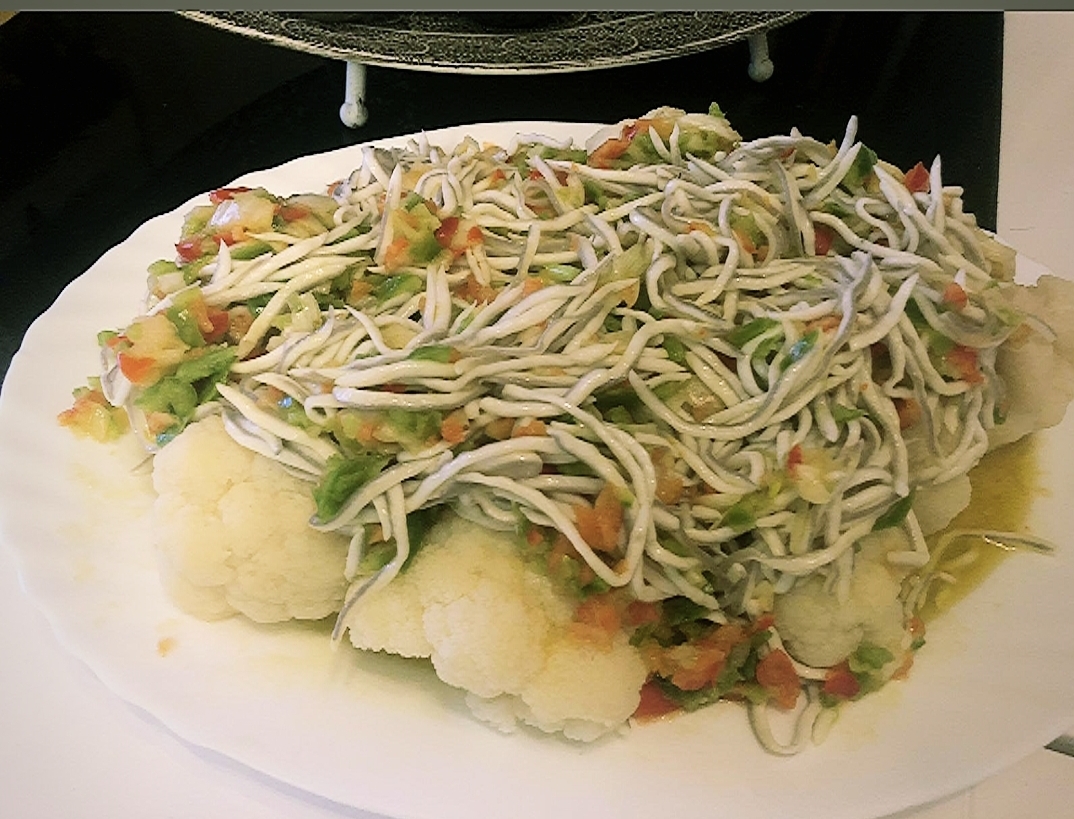 - Ponga 20 g de aceite y caliente 2min/120°C/vel cuchara. A continuación ponga las gulas 3min/120°C/giro inverso/vel cuchara. A continuación ponemos las gulas junto con la vinagreta y mezclamos . Ponemos todo encima de la coliflor.