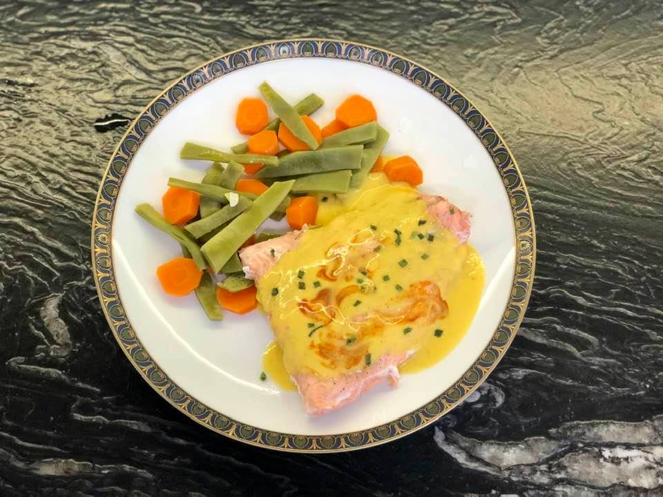 Retira el salmón del papillote, pon en un plato, espolvorea con el perejil y sirve caliente con la salsa y las verduras de acompañamiento.
