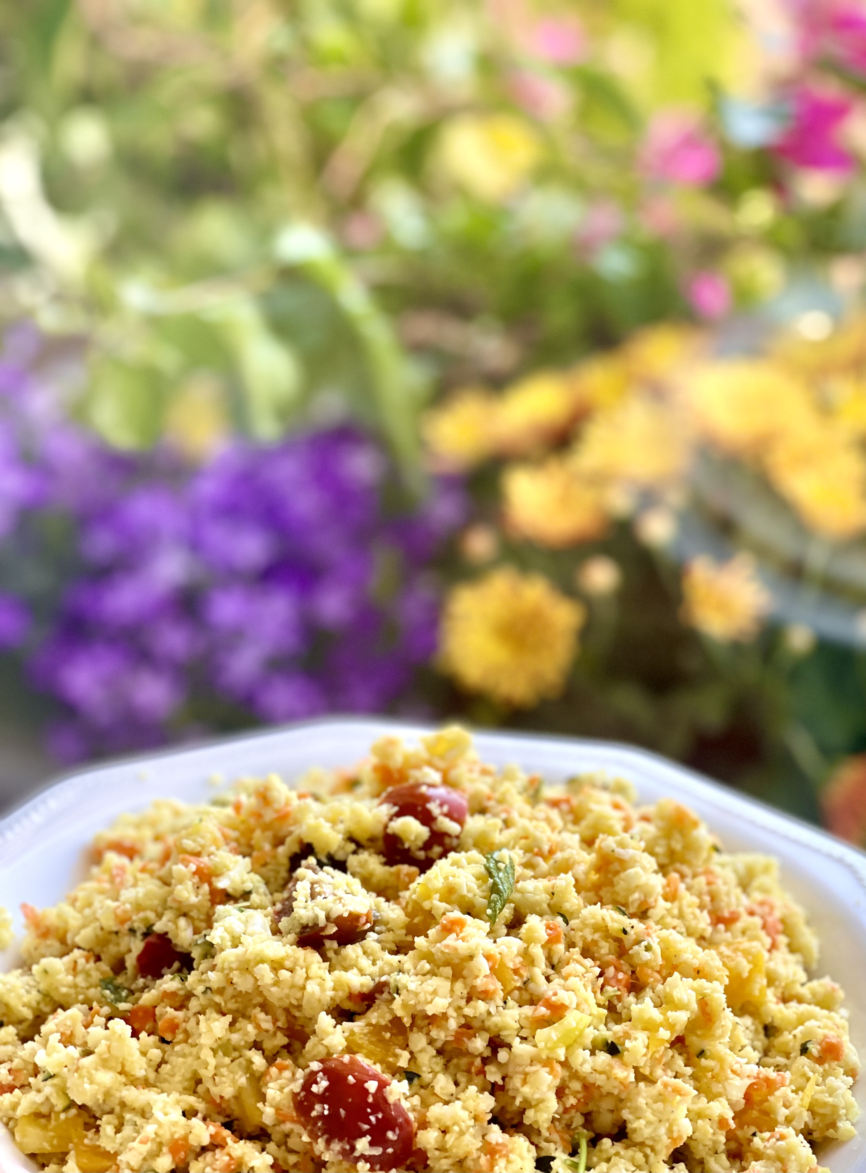 Cuscús de coliflor y verduras crudivegano 163 calorías
